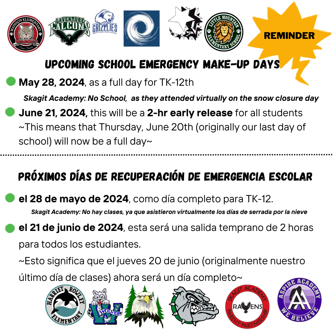 3 de mayo: (Casa) Fútbol masculino C vs. Jackson a las 5:00p.m, Softbol V en Blaine 12:00pm (Pipeline Fields)